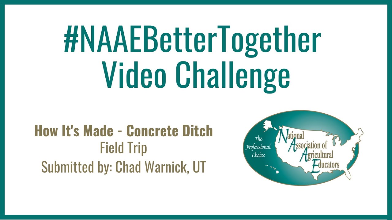 Submission for the 2020 #NAAEBetterTogether Video Challenge in the Virtual Field Trip category. Submitted by Mr. Chad Warnick, agriculture teacher at Delta Technical Center in Utah. "In this video it shows how ditches are dug and how concrete is poured in to make these concrete ditches. As part of the most developed irrigation system in the world the Sevier River system, relies on a complex series of reservoirs, canals, and ditches to supply water to the high desert farms of central Utah." - Chad Warnick, UT
